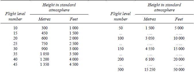 - Uçuş seviyeleri, standart atmosferdeki karşılık gelen yüksekliği feet cinsinden ve metre cinsinden yaklaşık eşdeğer yüksekliği gösteren aşağıdaki tabloya göre numaralandırılır. ICAO PANS-OSP Vol. III Sec. 2 Chp. 2 2.1.2