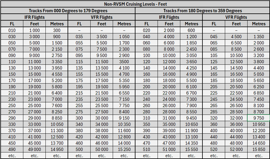 - Uçuş seviyesi sıfır (FL 0), 1013.2 hPa atmosfer basınç seviyesinde yer alacaktır. Ardışık uçuş seviyeleri, standart atmosferde en az 500 ft (152,4 m)’ye karşılık gelen bir basınç aralığı ile birbirinden ayrılacaktır. ICAO PANS-OSP Vol. III Sec. 2 Chp. 2 2.1.1