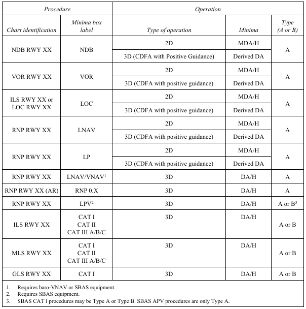 Bu yaklaşım tipi, operasyonun boyutundan bağımsız bir şemsiye terimdir. Yani bir Type A yaklaşması, dikey rehberliğin olmadığı ve MDH kullanılan bir 2D operasyon olabileceği gibi, dikey rehberliğin sağlandığı ve DH kullanılan bir 3D operasyon da olabilirICAO Doc 9365, 2.2.4. Geleneksel isimlendirmeyle bildiğimiz çoğu NPA usulü ve bazı durumlarda APV usulleri, limitleri gereği bu sınıfın içerisine girmektedir.